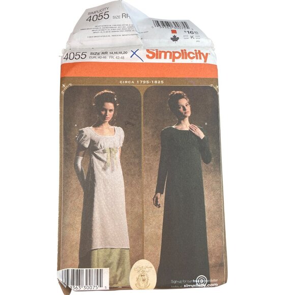 This Simplicity 4055 sewing pattern creates Regency-style dresses with authentic detailing using broadcloth, muslin, or taffeta. Includes sizes RR 14-20 for elegant, vintage recreations.