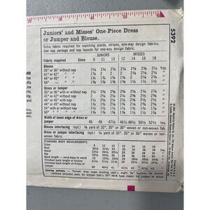 Vintage Simplicity 5392 sewing pattern for Juniors' and Misses' one-piece dress or jumper and blouse, size 12 (bust 32). Includes 12 precut pattern pieces. Previously used, normal package wear.