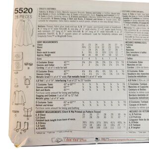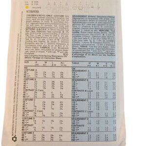 These are two complete sewing pattern packs for creating children's costumes. Simplicity 5520 offers a range of designs, including medieval-themed outfits such as a princess gown, knight attire, and a Viking-inspired ensemble. Butterick B4319 patterns include whimsical costumes like a devil, jester, and traditional characters. Both patterns feature sizes for children ranging from 3 to 14, allowing for a variety of fits. The designs are detailed with fabric material suggestions, measurements, and specific notions required. These patterns are presented with comprehensive, multilingual instructions to make sewing straightforward.