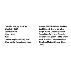 Simplicity 8301 Pattern Jacket Miss 18-24 Uncut Vintage Plus Size Blazer Pockets