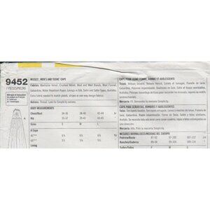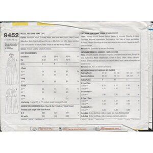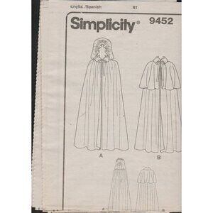 Vintage Simplicity 9452 sewing pattern to make a unisex adult and teen cape costume pattern for cosplay, Ren Faires, Halloween and theater. Makes a long, lined cape with an option for a capelet layer. Fits men, women and teens in Size Small-Medium-Large. Pattern is uncut and neatly folded, but I'm not sure that they're factory folds. Can be used for Phantom of the Opera, vampire, Dracula, goth, wizard, reaper, maiden, magician and Ren Faire costumes. OOP pattern designed by Heigl & Nordstrom and copyright 2000.