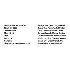 Simplicity 9827 Pattern Jacket Miss 10-20 Vintage Slim Layer Long Unlined