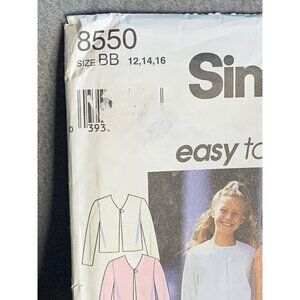 Simplicity uncut sewing pattern 8550, suitable for girls' jacket, top, skirt, and pants in sizes 12-16. Perfect for custom clothing creations.