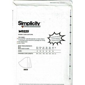 Simplicity Sewing Pattern 0225 Misses Cape Costume Easy Size 8-18