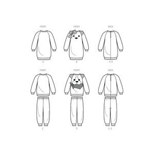 Easy, comfy loungewear for boys and girls have fun applique animal faces. Cuffs, neckband, and lower edge of dresses and tops are knit bands.