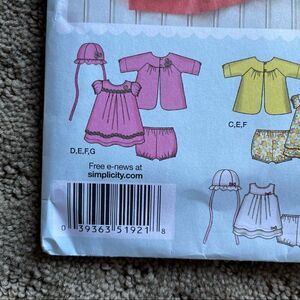 Simplicity Simply Baby Pattern 1921 Baby Outfits with Bonnets Size XXXS-L UNCUT