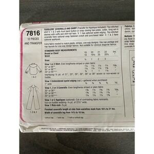 Simplicity Vintage Cut Toddlers Coveralls and Shirt Size 2 and 3 Pattern 7816