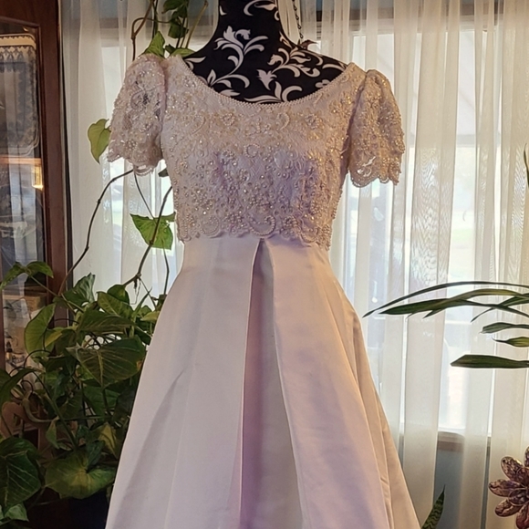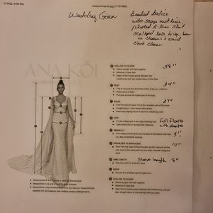 Size Small. 34" Bust, 27" pleated waistline that flares out to 40" at hipline. 58" hollow to floor. 14" shoulder to shoulder. 5" armhole, 8" sleeve length. extra fabric in seams. bodice can be let out up to 3". Alterations available with extra fee.