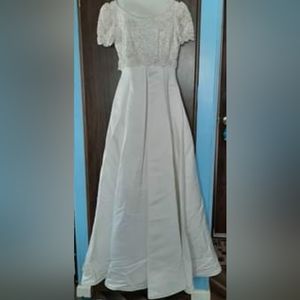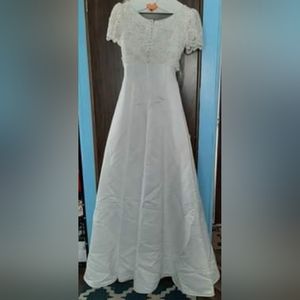 Beaded Lace Bodice Wedding Gown. Wide scoop neckline with scalloped lace hem on sleeves and at waist. Pleated A-line full dress made of white Bridal Satin.