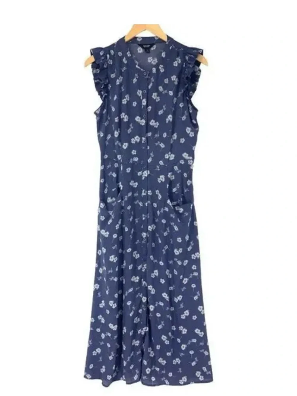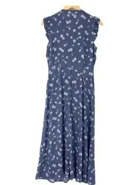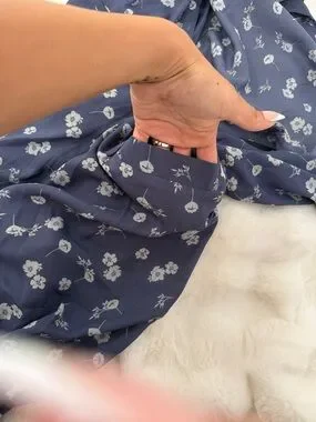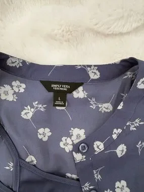 Light blue blouse with white floral print. Button-front neckline. Soft, flowy fabric. Classic, versatile style.
