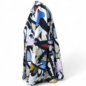 The colors are bright, but not garish, a rich muted offering of so many colors -- white, black, dark green, light green, slate blue, medium blue, rich red, mauve, and light purple - in a modernistic graffiti-like style. You can style it closed and alone or with a shell or blouse underneath. It can dress up casual pants (even jeans) or look stunning with a pencil or slim capris or slacks.