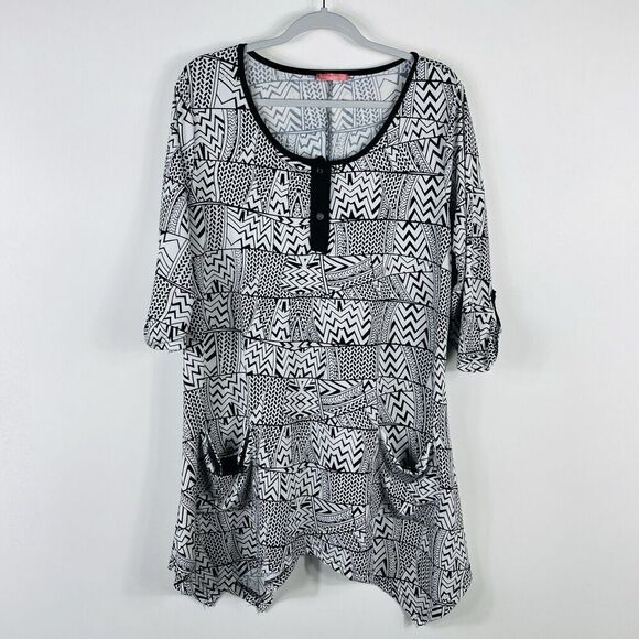Simply Aster By Firmiana Size 1X Abstract Print Tunic Top White Black 3/4 Sleeve