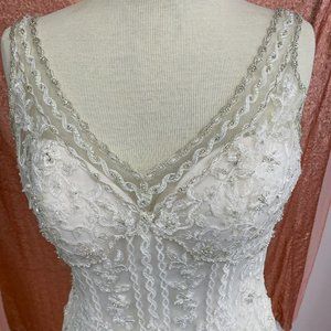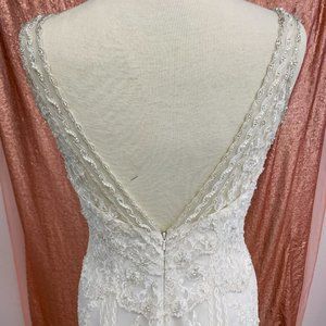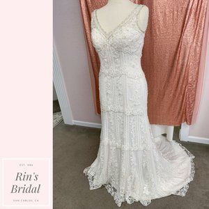 Featuring a deep V-neck and V-back, the detailed lace on this gown forms slim scalloped tiers and accents the skirt and sweep train.