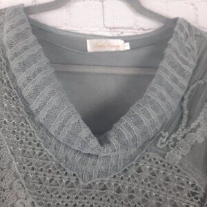 A loose cowl neck frames the face. A blouse with everything on it--crochet, embroidery, lace, chiffon. A unique combination of designs creates a mosaic of fabric all in one tunic. Lightweight knit lining. The overlay gives the illusion of sheer without the see-thru. Very soft and comfortable. Fun for the Fall and Winter.