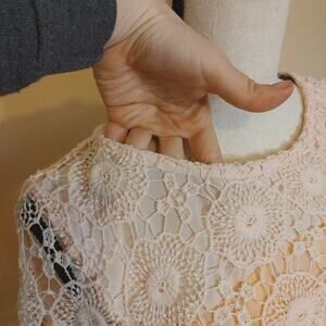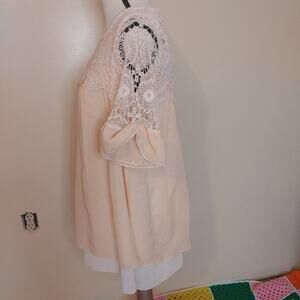 Simply Couture Pale Pink Blouse Size Medium M Lace Crocket Short Sleeve Sheer