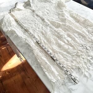 Ivory lace pattern with delicate fringe on hem and cuffs. Button down and collared neckline.