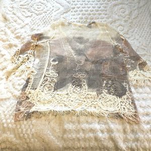 Simply Couture NWOT lace embroidered v-neck pink, cream and gray top. No size tag- measures 20” from armpit to armpit and 25” from shoulder to bottom hem. I am listing this as one-size but please check photos and measurements.