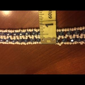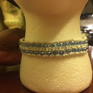 “Simply Elegant” handmade beaded choker with studs matching earrings. Color is baby blue and White beads. New and Never been used. See measurements in photos attached here. Gold hardware. No hold and no trade.