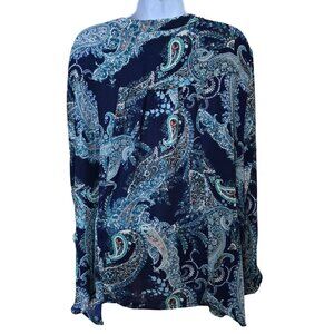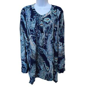 Simply Emma Womens Paisley Long Sleeve Tunic Top 2X Navy & Teal Polyester
