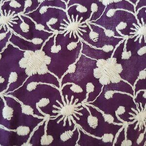 Retro Style Simply Envogue 100% cotton apron. V-neckline purple apron has eyelet embroidery & one front pocket. Scalloped hem. Ties in back at waist & neck.