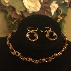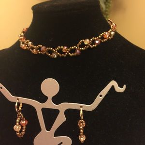 “Simply Gorgeous” Handmade beaded choker and matching earrings. Color is brown. New and Never been used. See measurements in photos attached here. Gold tone hardware. No hold and no trade.