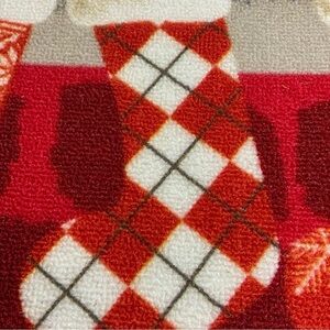 Festive Christmas Holiday rug for any room with Christmas Stockings and a Candy Cane Print. Festive Fun Colorful and nostalgic. Super cheerful for any room where you want to add seasonal accents. Ideal for the Kitchen, Foyer, Bath, Office and so on. The low profile design allows for doors to open and glide easily over it. It lays flat and stays there.