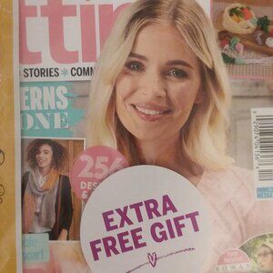 This Simply Knitting magazine is still factory sealed and includes a cute pair of beehive-themed knitting needles, a tin with 50 metal stitch markers, and an additional Burda Knitting Lace Knitting booklet/magazine.