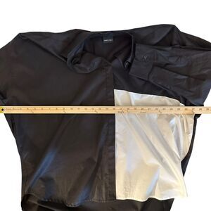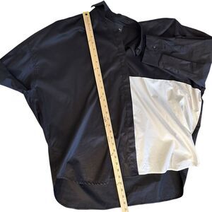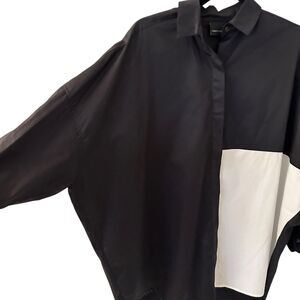 Add a modern twist to your wardrobe with this Simply Mila USA black and white colorblock shirt. Made from breathable cotton, it features a button-up front, relaxed dolman sleeves, and a stylish boxy silhouette. Perfect for pairing with jeans or trousers for an effortlessly cool look. Size Medium.