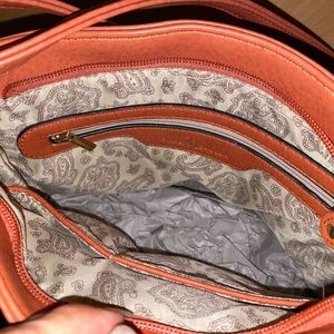 It is coral and features three inside pockets, an adjustable strap, a twist-knob lockable outside pocket with two zip up side pockets, and the fabric print inside the pockets is paisley.