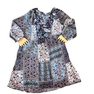 This Simply Noelle dress is a perfect addition to your wardrobe. The dress features a patchwork design with a V-neckline and 3/4 balloon sleeves. The dress is made of lightweight chiffon material and is perfect for summer, fall, and spring seasons. The dress comes in a multicolor design and is available in S/M size (8-10). The garment care is easy as it is machine washable. The dress has a pullover closure and an attached slip for convenience. The collarless design and sheer fabric add to the boho chic look of the dress. The dress is perfect for travel, parties, or casual occasions.