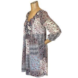 Description: Simply Noelle Flowy BOHO Patchwork Print Pocket Dress with Attached Stretch Slip, Swim cover up, V-Neck, 3/4 Balloon Sleeve, 2 Slit Pockets,