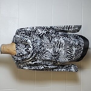 Simply Noelle Dressed up Soft Over Sized Tee Shirt Knit Animal Print Hoodie 1/4 button up Sheer Detail Trim Silver Hardware (Buttons, String ends)
