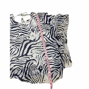 Features: flowy, zebra print top, animal print, navy, white, attached white tank top, loose zebra print cape, hi-low, back ties at the top for added detail, blouse
