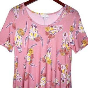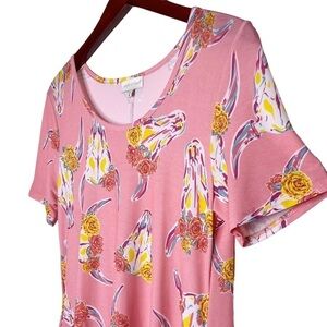 Beautiful Floral Bull Cow Skull Print Tassel Trim Dress from Simply Southern. This Dress features a fun, flirty design with its tassel trimmed hemline. Soft knit Polyester and Spandex blend that offers a beautiful relaxed, drape fit. South Western Boho style with its all over floral and cow skull print in Pink. Round neckline and a Purple tassel detail at hem. Woman’s Size Small