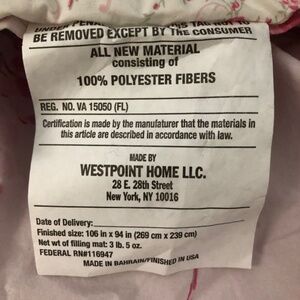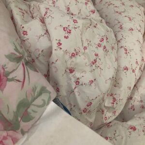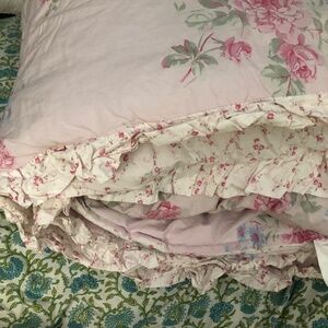 Floral comforter set Simply Shabby Chic from Target King size Excellent condition -- no signs of wear 3 pieces: 1 king comforter and 2 king pillow shams Floral print is called Misty Rose Shades of pink with touches of blue and green Comforter details: * It's reversible, with large-scale print on one side and small print on the other * Ruffle edge on three sides * Ruffle fabric is the small-scale print * Fabric is 100% cotton; fill is 100% polyester Sham details: * Large-scale print on front, small print on back * Envelope closure on back * Ruffle edge on all four sides * Ruffle fabric is the small-scale print * Fabric is 100% cotton I'll cover the shipping on this set, which will need a oversized box with an upgraded shipping label. NOTE: The manufacturer's photos include coordinating items that are not included. My listing is for a comforter and two shams. Pillow inserts not included. Also, sorry for the zany background in some of my photos. I threw down a clean sheet to use as a pristine surface but didn't think about the clashing print. Simply Shabby Chic Target Misty Rose king comforter shams pink