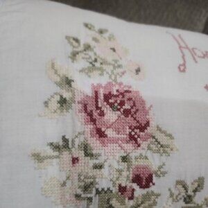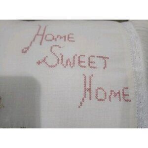 The Simply Shabby Chic Home Sweet Home Pillow is a charming vintage-style toss pillow featuring an embroidered ruffle design with a cross-stitch pattern. Made from 100% cotton in a white color, polyester filled, this rectangular pillow measures 10 x 15 inches and is adorned with the phrase "Home Sweet Home." Its cottage-style appeal makes it a perfect addition to any cozy home decor setting, adding a touch of shabby chic elegance to your living space. See pictures for signs of wear, age, condition and beautiful details.