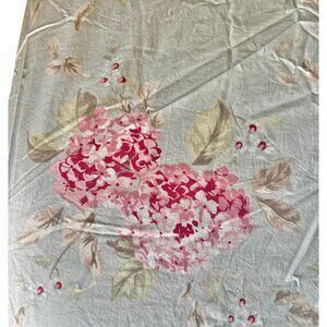 This queen-size floral cotton duvet cover features a timeless pink and green hydrangea pattern on a very light blue background (think a very pale robin’s egg blue).