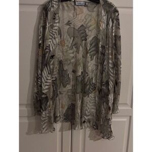 Simply Silk Cardigan Duster Floral Leaf Print Sheer Green Gray Cover Up silk