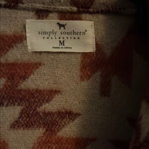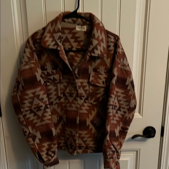 Stylish vintage jacket with an Aztec pattern. Features a button-up front and two chest pockets. Perfect for adding a unique touch to your outfit.
