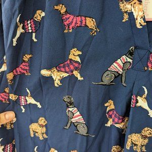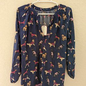 Adorable blouse with dogs in sweaters pattern, nice v neck style, and pink ruffled detailing on bottom hem. New with tags, never worn. Measurements laying flat: pit to pit: 19", pit to bottom hem: 17", shoulder to shoulder: 16", sleeves: 24"