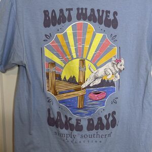 Simply Southern Boat Waves Lake Days Light Blue Dog Dock T shirt Tee Size Medium 100% preshrunk ring spun cotton. Crew neck. Pull over.