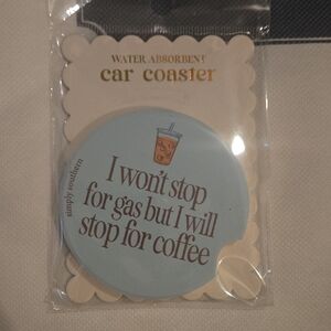 Includes red and teal socks with letter details. Rhinestone tumbler with black and white checkered pattern. Comes with pink and black scrunchies. also includes one car coaster "I won't stop for gas but I will stop for coffee"