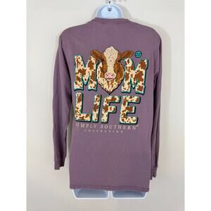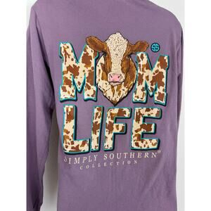Adorable “Mom Life” long sleeve tee by Simply Southern in a soft dusty purple. Features cow-print letters with a cow graphic on the back and matching printed front pocket. Perfect for layering and lounging.