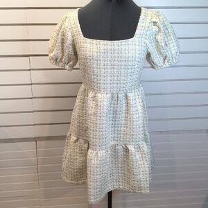 Chic Ivory tweed dress with gold thread. Featuring puff sleeves and a tiered skirt. Perfect for stylish occasions. NWT, excellent condition. Size Small
