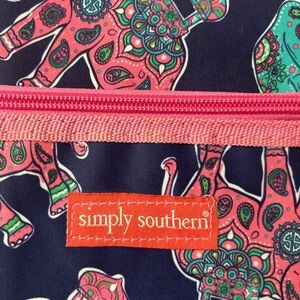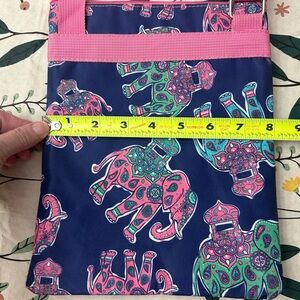 Simply Southern Crossbody with Elephants…Blue…Pink. See measurements in pics. Adjustable. Used condition. Couple small spots on strap. See last 2 pictures. 3 separate zip areas on outside. No inside pockets.