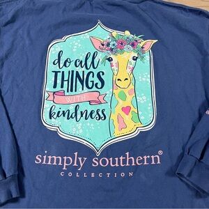 Simply Southern Women’s Long Sleeve colorful giraffe design and 'Do All Things With Kindness' text. Simply Southern branding on the sleeve.