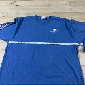 Colors: Blue shirt with pink yellow and teal in graphic and ight pink branding