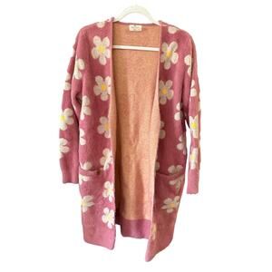 Simply Southern Fuzzy Daisy Print Long Open Front Duster Cardigan Sweater Size Small Pink