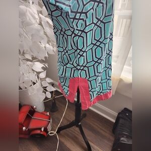 The Simply Southern tunic top features a geometric "baklava" print in shades of teal and navy, accented with solid pink trim at the V-neckline, cuffs, and hem. This 3/4-sleeve tunic is made from a comfortable fabric and has a relaxed fit. The brand, Simply Southern, is known for its preppy, Southern-inspired style and casual wear.