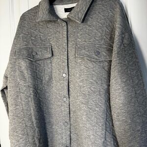 Chic gray quilted jacket with button-up design. Includes two chest pockets.